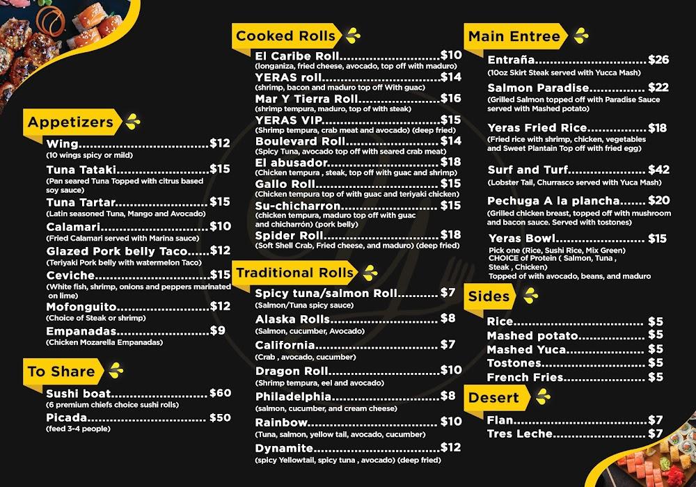 Yeras offers a diverse menu featuring both Latin and Japanese staples. Expect flavorful plates like sushi, grilled meats, and more. Sweet and savory fusion dishes stand out, appealing to adventurous eaters. Regular specials keep things fresh. The culinary team emphasizes quality ingredients and bold flavors.